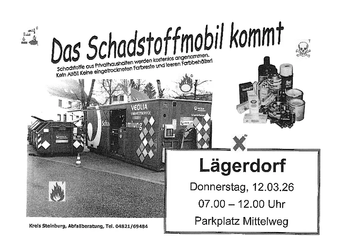 Am Donnerstag, 12.03.2026, in der Zeit von 07.00 - 12.00 Uhr auf Parkplatz Mittelweg in Lägerdorf Es besteht die Möglichkeit, Schadstoffe aus Privathaushalten kostenfrei abzugeben.Weitere Informationen zu Schadstoffen aus Privathaushalten finden Sie im Flyer.
